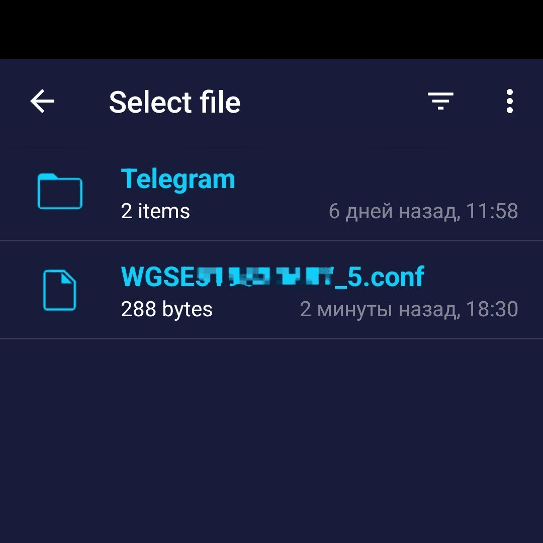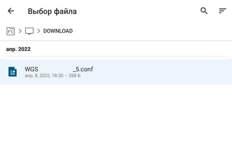 Откроется файловый менеджер. Найдите файл конфигурации .conf, загруженный из бота. Обычно он хранится в папке Downloads.