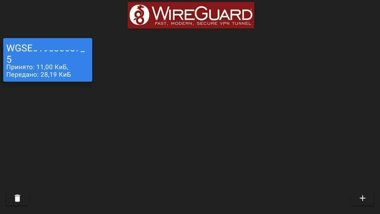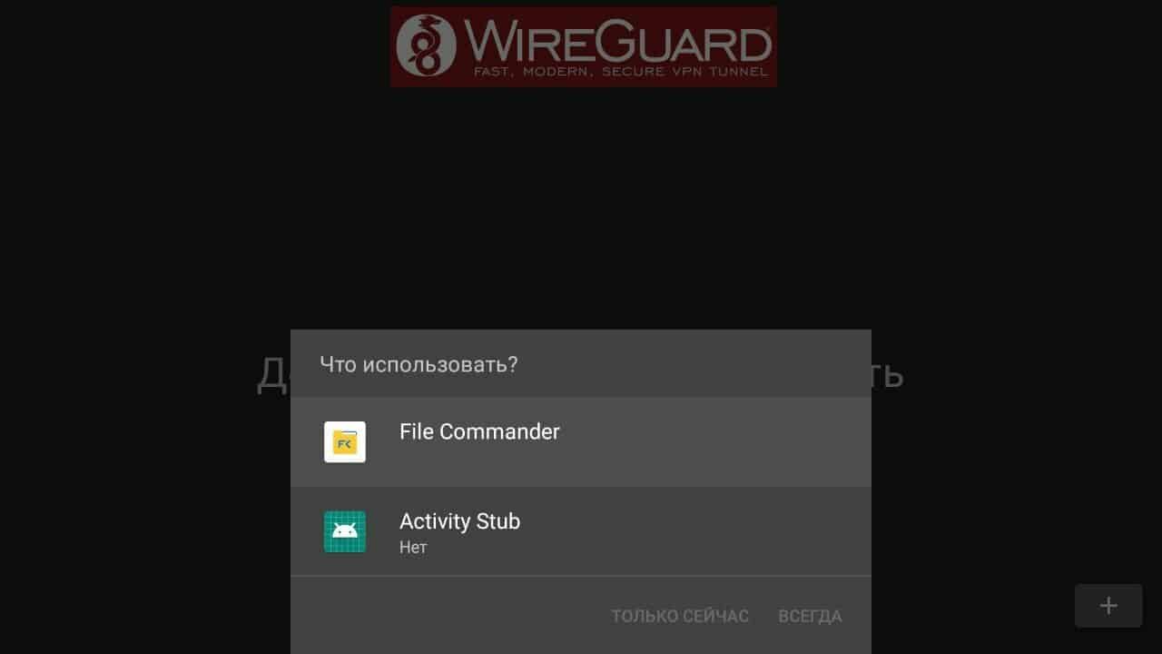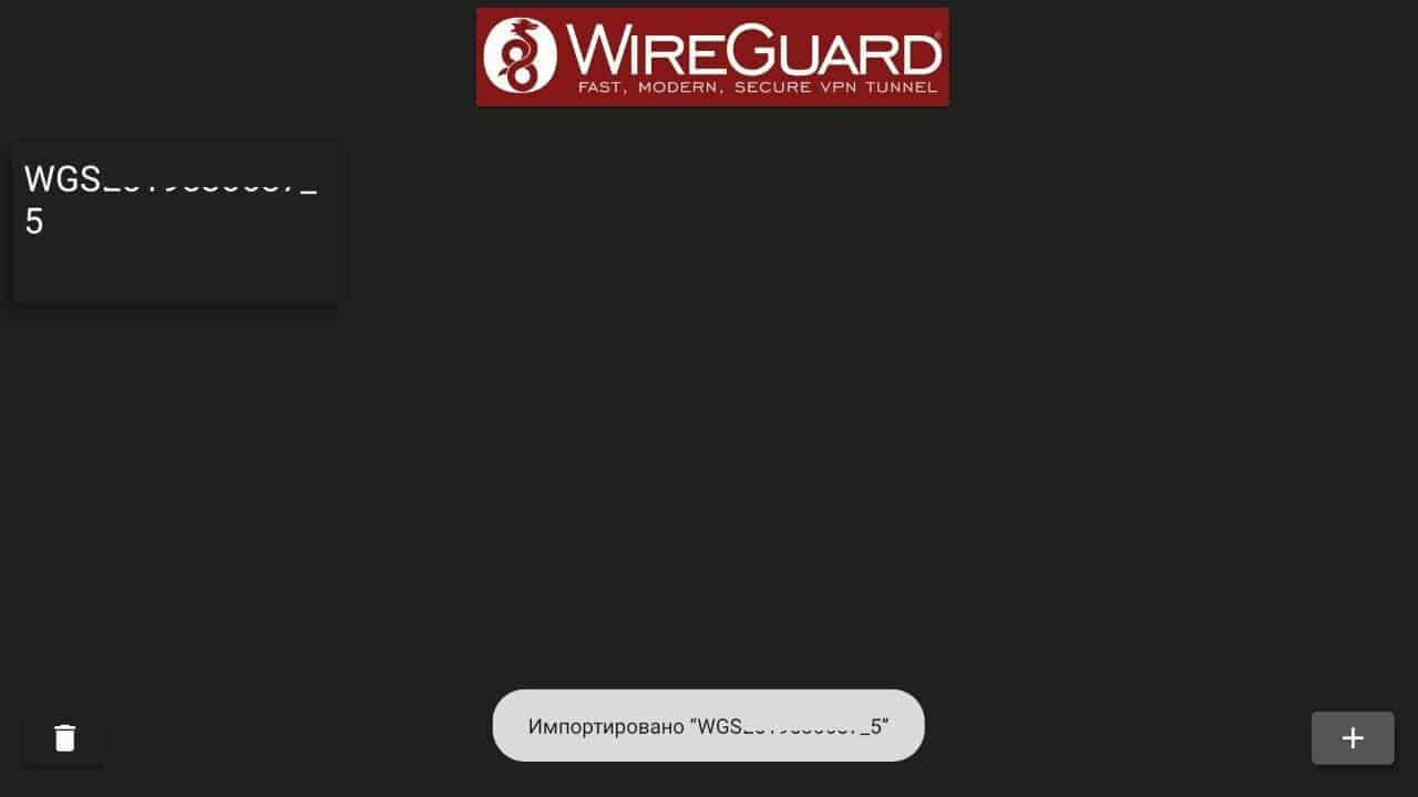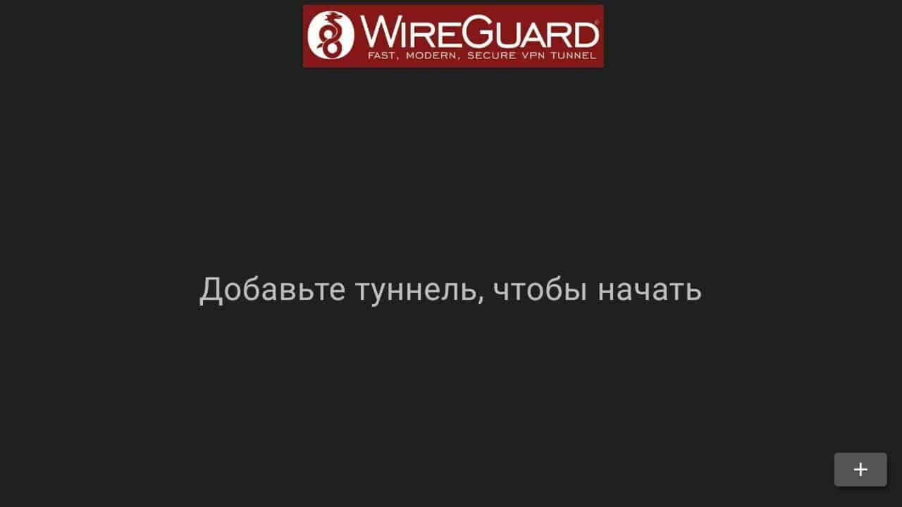 Откройте приложение WireGuard на телевизоре. Нажмите кнопку добавления конфигурации – кнопку со знаком «+» в правом нижнем углу.